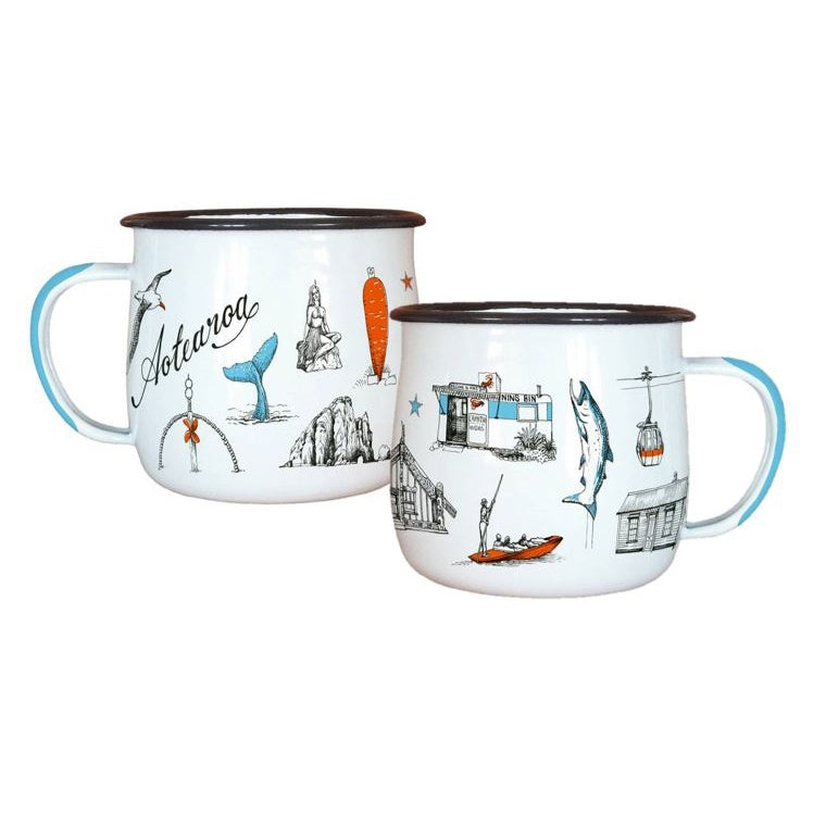 Sip in style with the Aotearoa Enamel Mug from Wolfkamp & Stone, featuring bold and beautifully illustrated designs celebrating New Zealand's significant landmarks and cultural icons. Lightweight yet sturdy, it’s perfect for road trips, camping, or simply adding a touch of Kiwiana charm to your daily tea or coffee. A practical and eye-catching keepsake or gift.