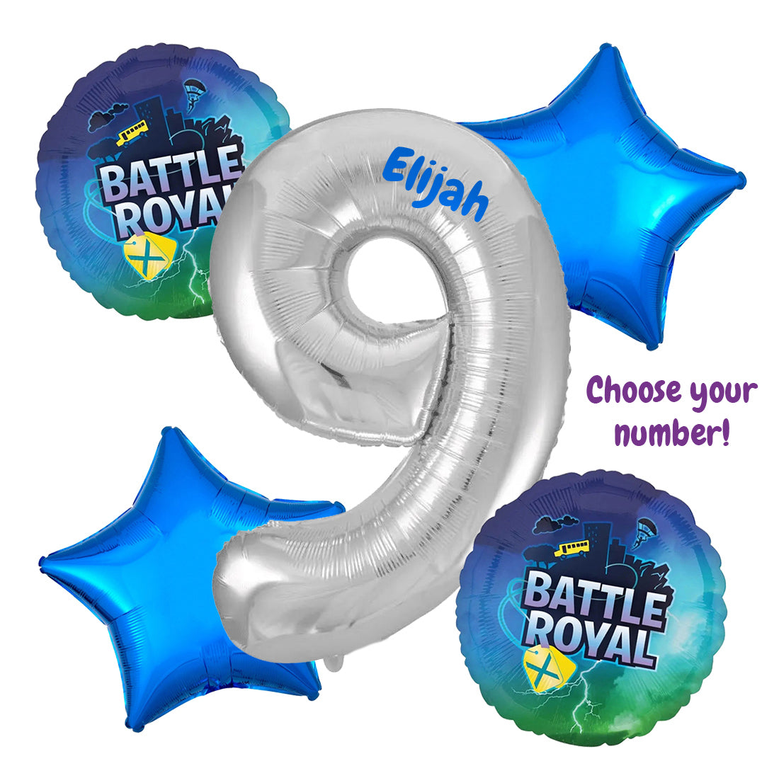 Contains: 1 giant silver number balloon, 2 Fortnite Battle Royale foil balloons, and 2 metallic blue star foil balloons