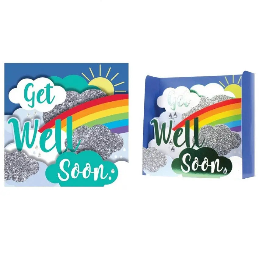 Wish a speedy recovery with this fun 'Get Well Soon' card featuring bright rainbow colours with foil and glitter embellishments.