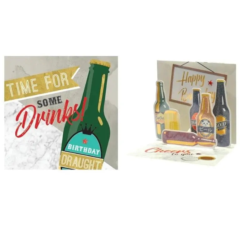 This fun card reads 'time for some drinks' and opens to reveal pop up beer bottles. Glitter and foil embellishments, with message that reads: 'happy birthday cheers to you'. Perfect card for a young mans 21st birthday.