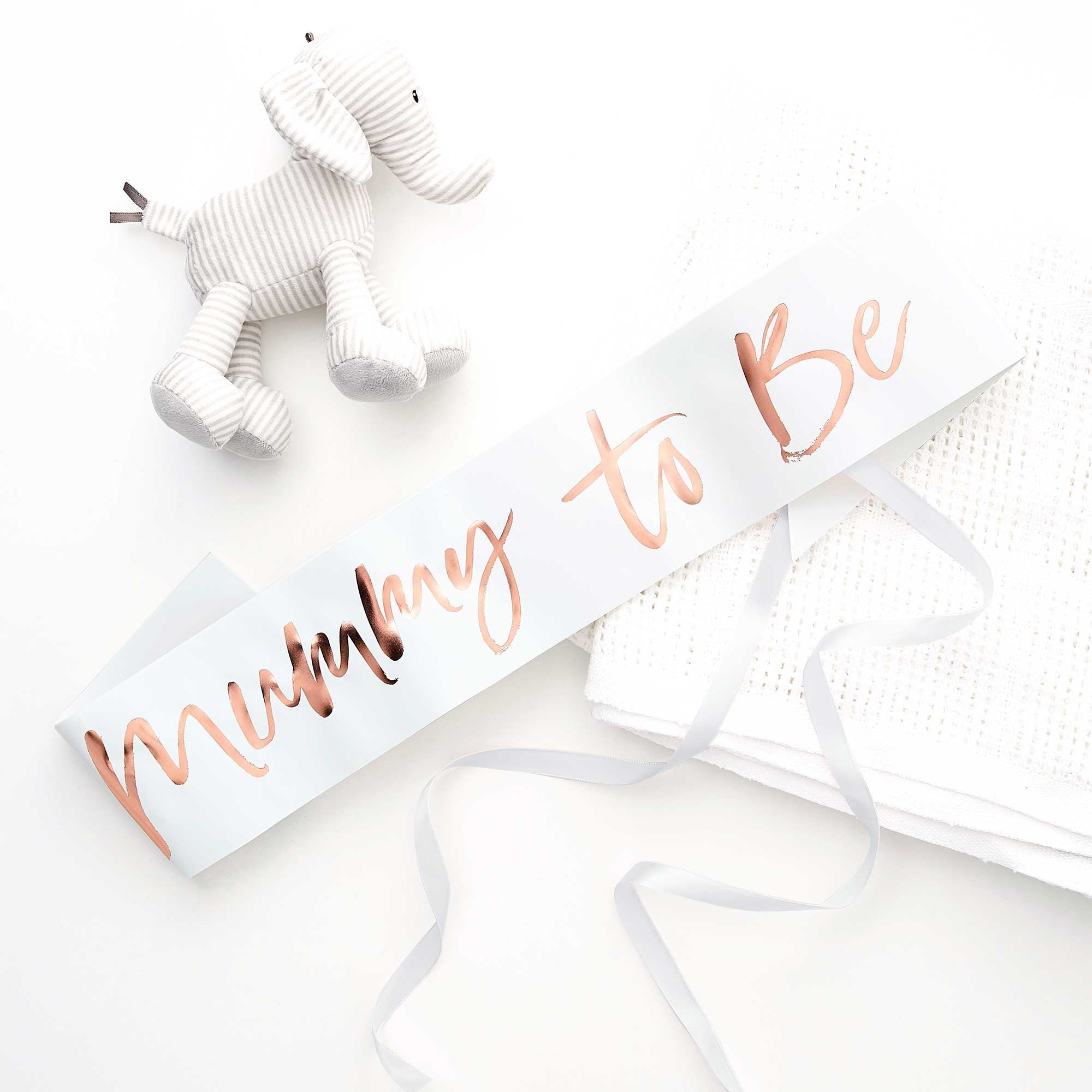 This delicate sash features beautiful rose gold foiled 'Mummy to Be' script on a white soft paper background. The adjustable ribbon tie makes this a handy one size fits all.