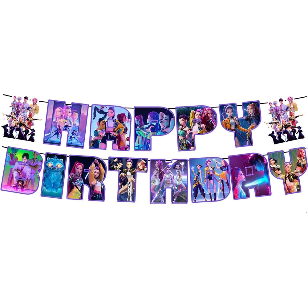 Level up your party with this KPop Demon Hunters Happy Birthday Banner! Bright, eye catching, and featuring the iconic Huntrix girls and Saja Boys (and the lovable Derpy tiger), this garland creates the ultimate backdrop for your celebration. A must-have decoration for any KPop Demon Hunters party!