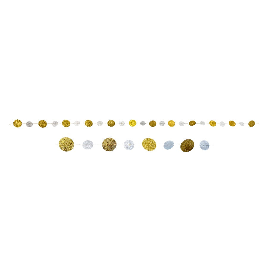 This stunning gold and silver glitter dot garland will add some magic to any room. Great for dressing up fancy party themes like 21st, bridal showers and Great Gatsby 20s. Looks stunning combined with latex balloons in matching colours.