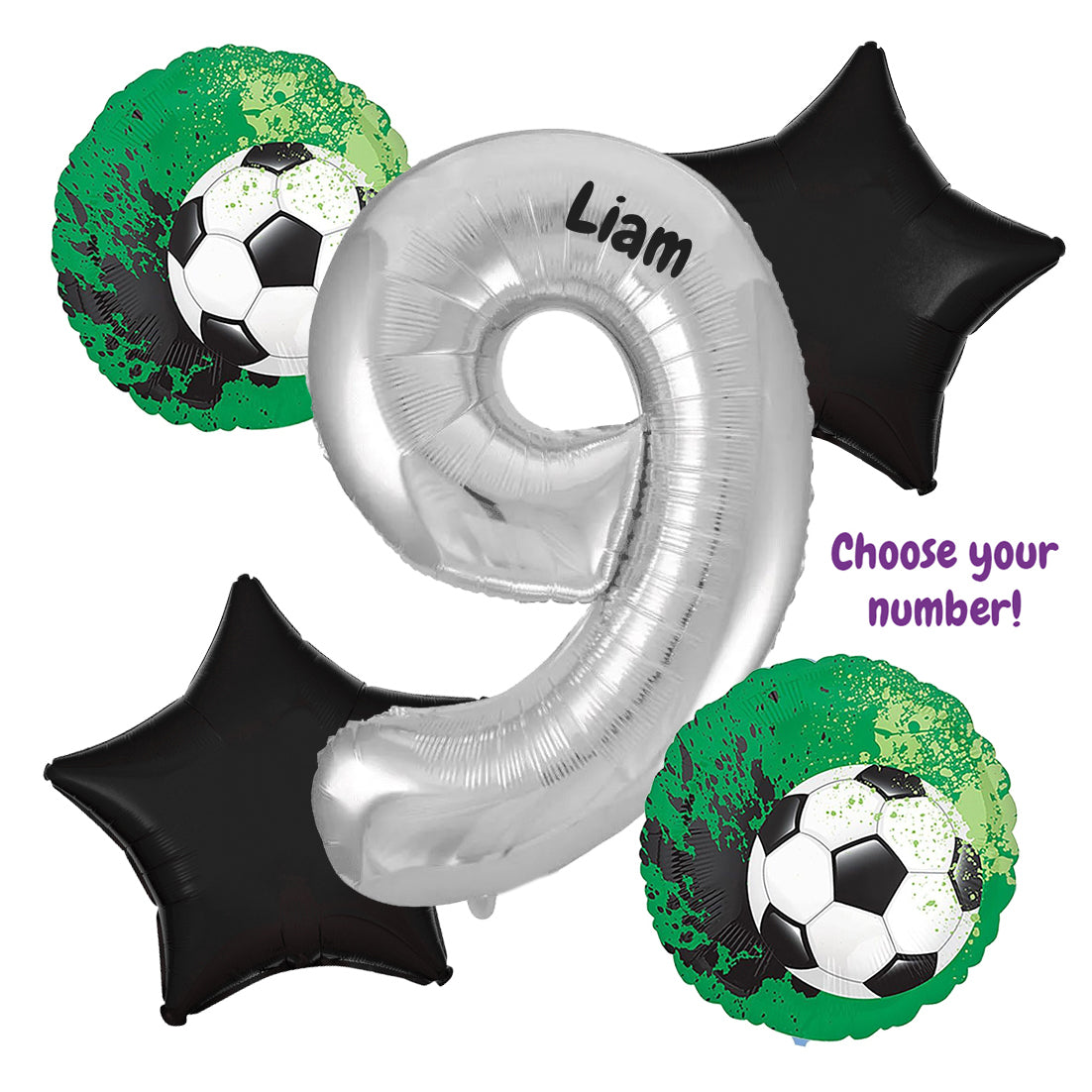 Contains: 1 giant silver number balloon, 2 soccer foil balloons, and 2 black star foil balloons