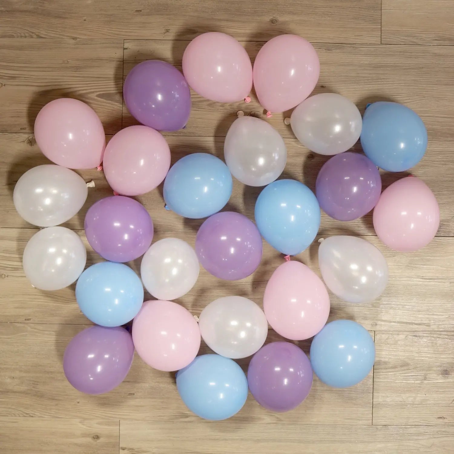 Contains: 60 mini balloons in a mix of light pink, light blue, lavender and pearl white