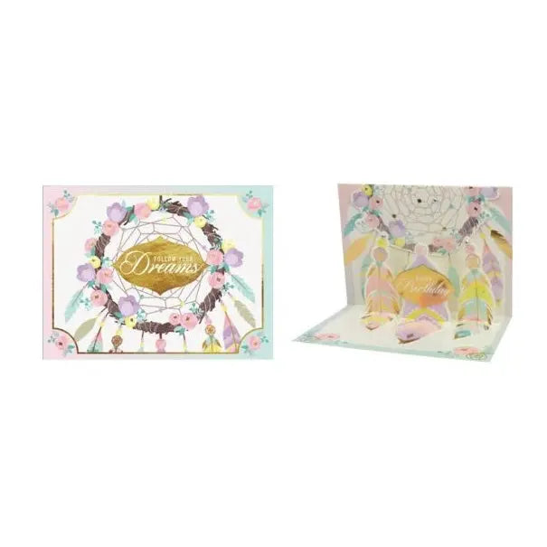 Wish a happy birthday with this gorgeous pop up card that opens to reveal a 3d dreamcatcher in soft pastel colours.