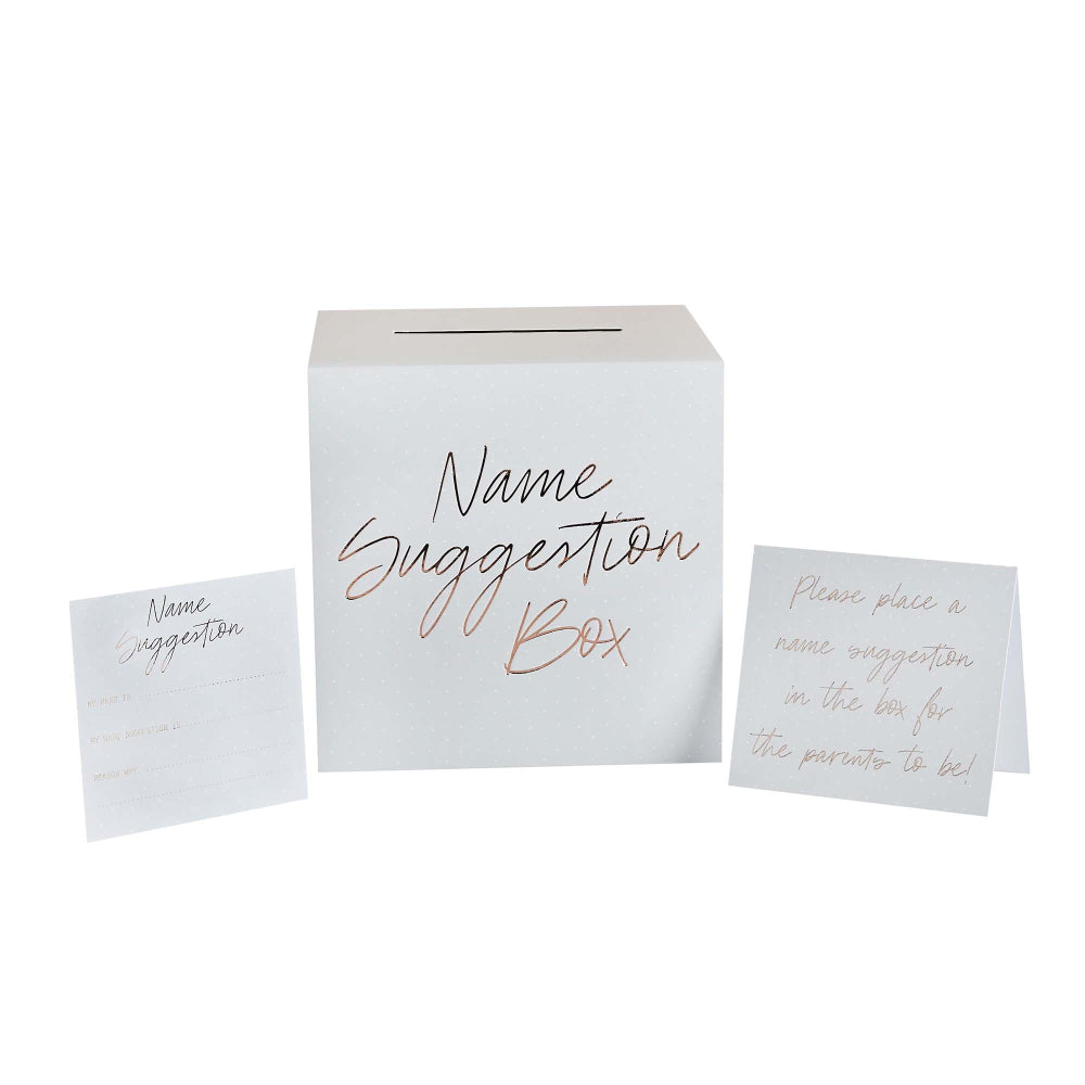 Contains: 1 x name suggestion box (20cm), 30 x foiled name suggestion cards and 1 x sign